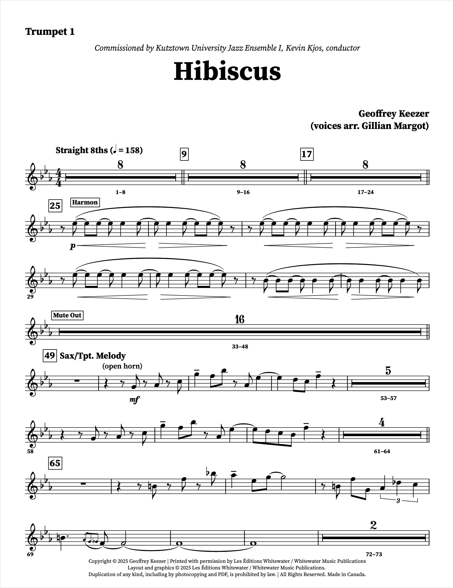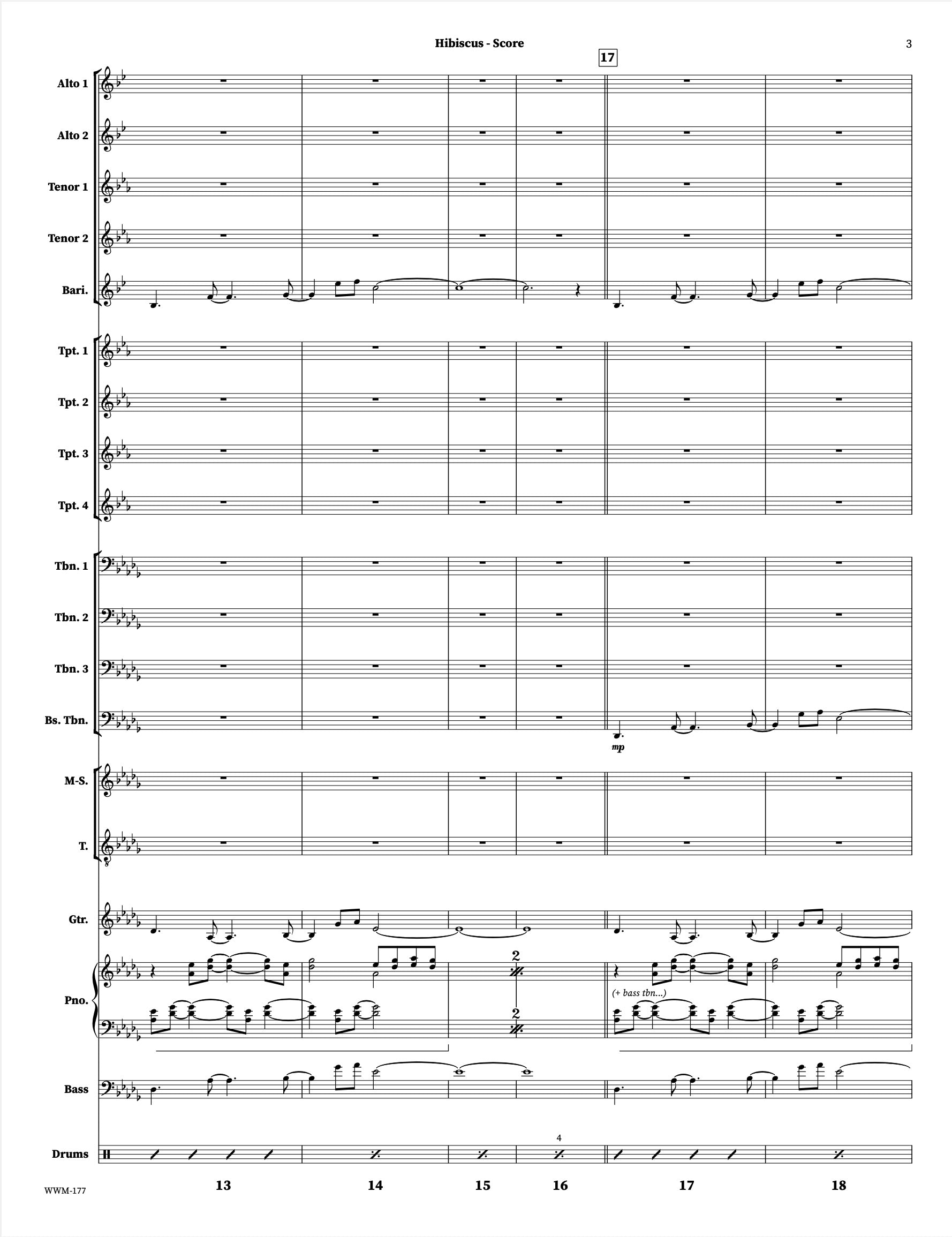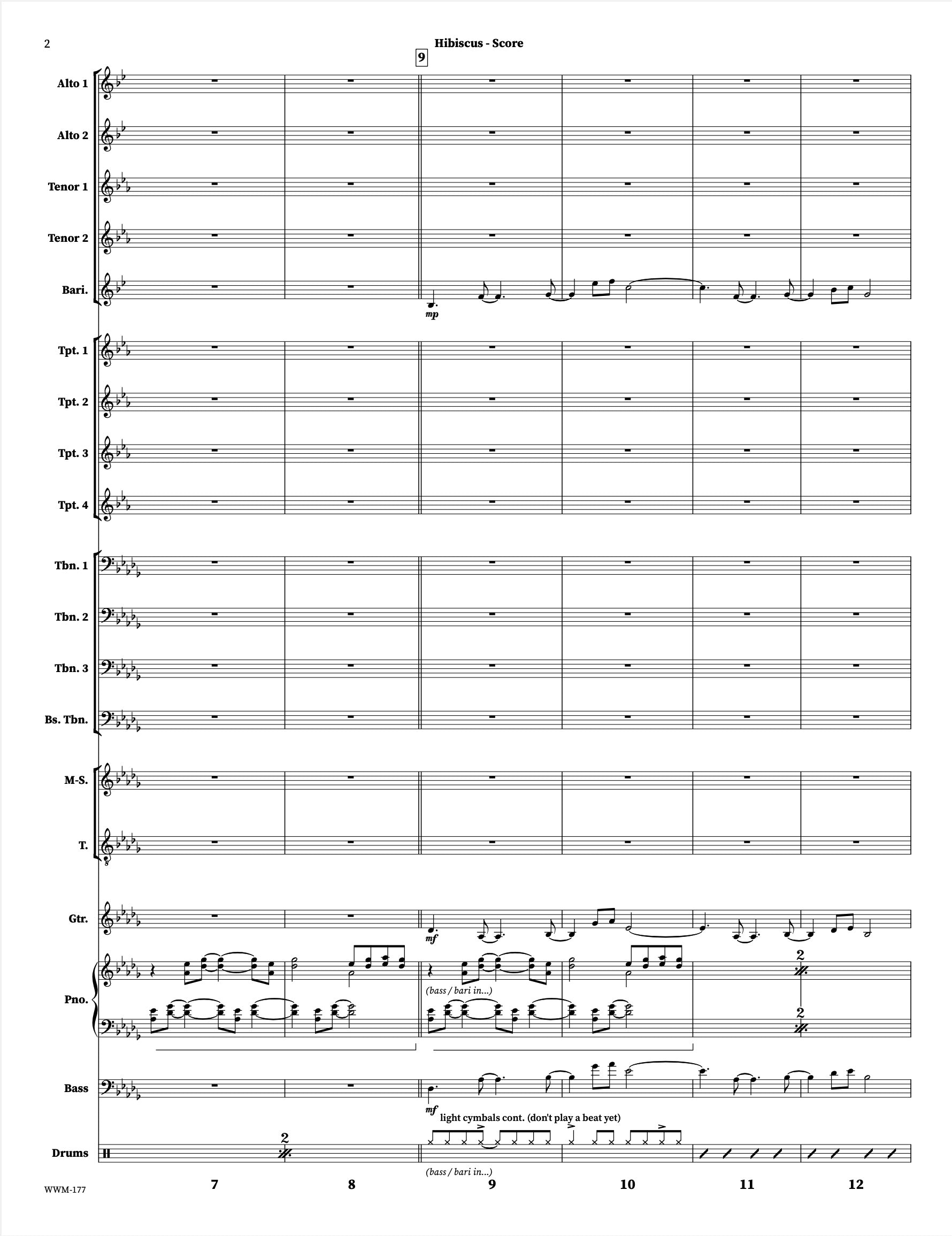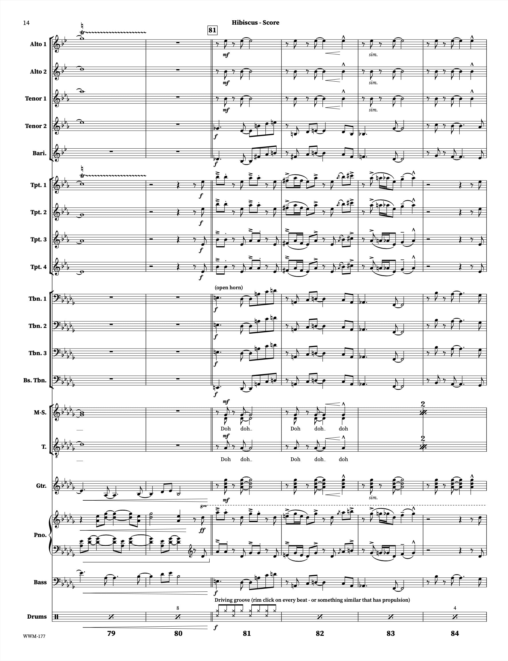 A contemporary original composition with an even-eighths feel,"Hibiscus" features the rhythm section prominently throughout, and includes plenty of creative material for the full ensemble.