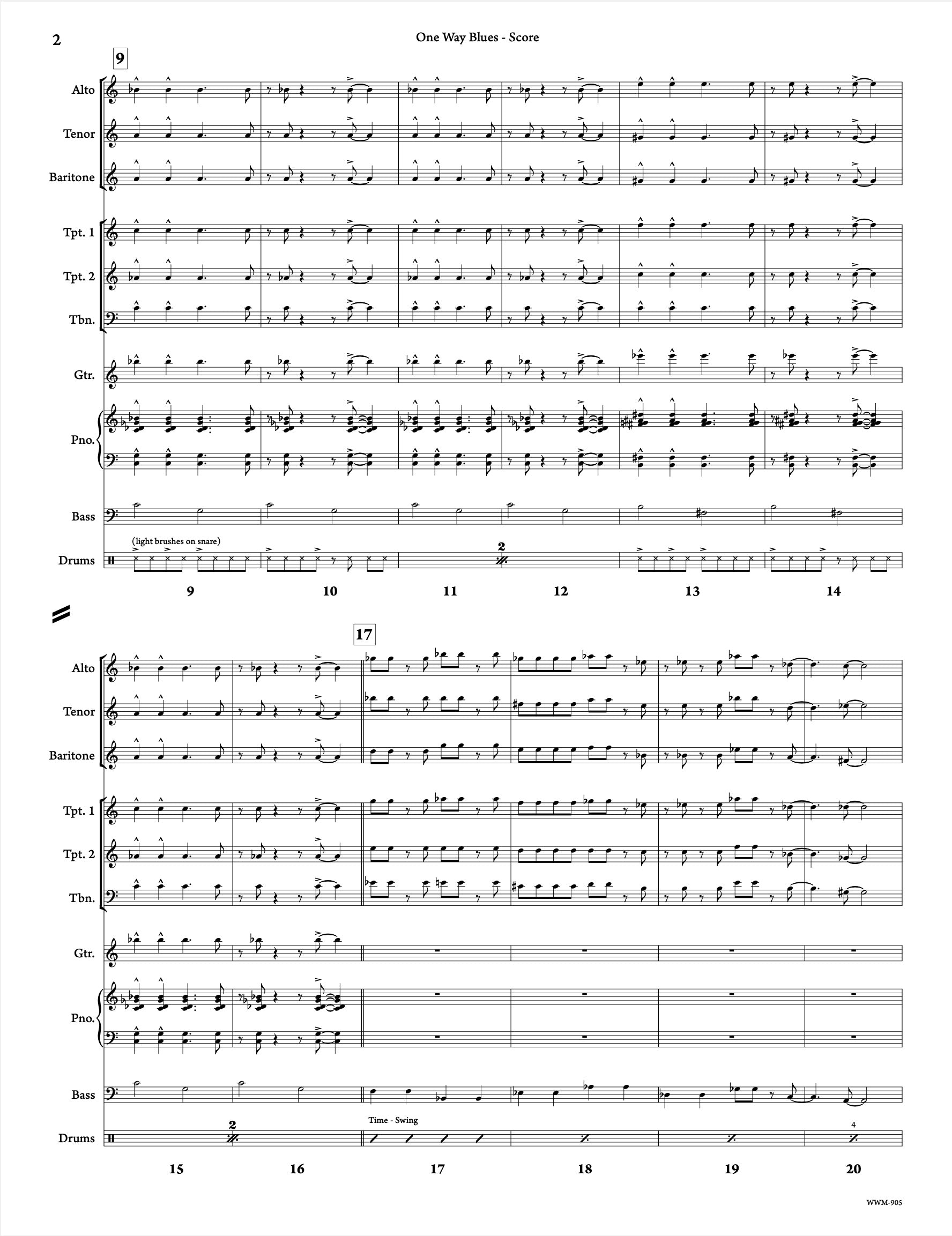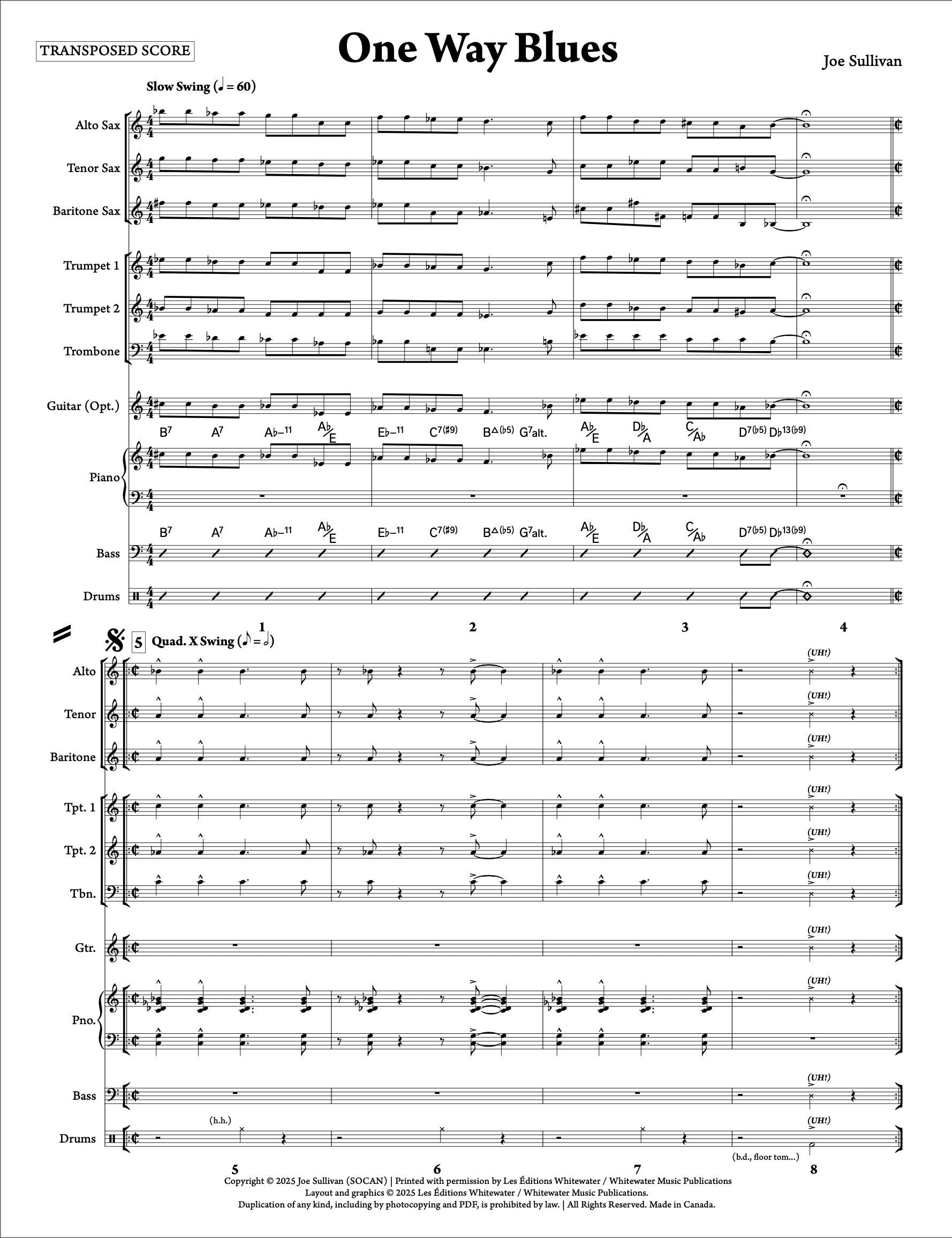 Arranged for: alto sax, tenor sax, baritone sax, 2 trumpets, trombone, guitar (opt.), piano, bass, drums