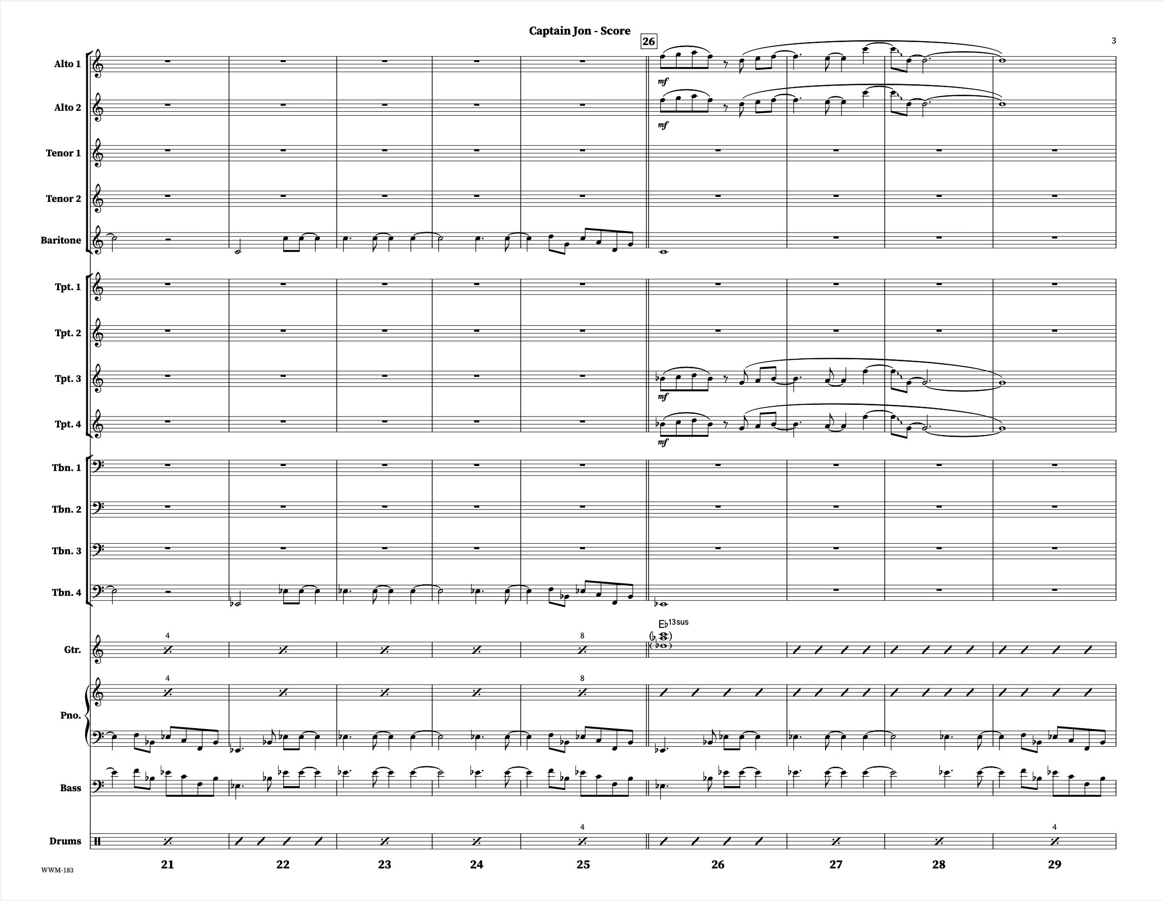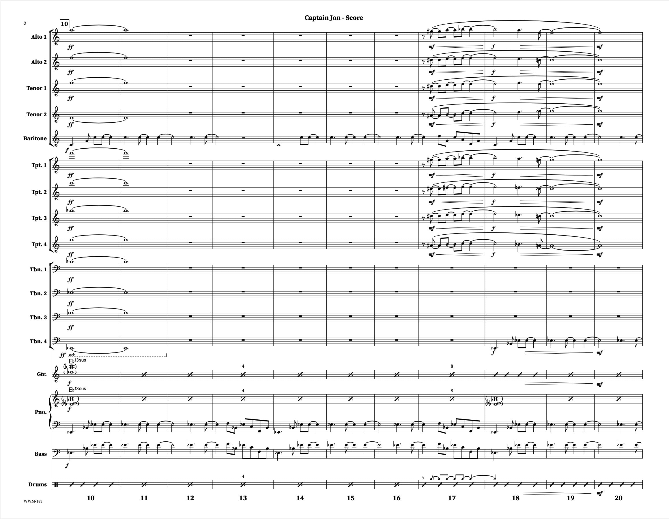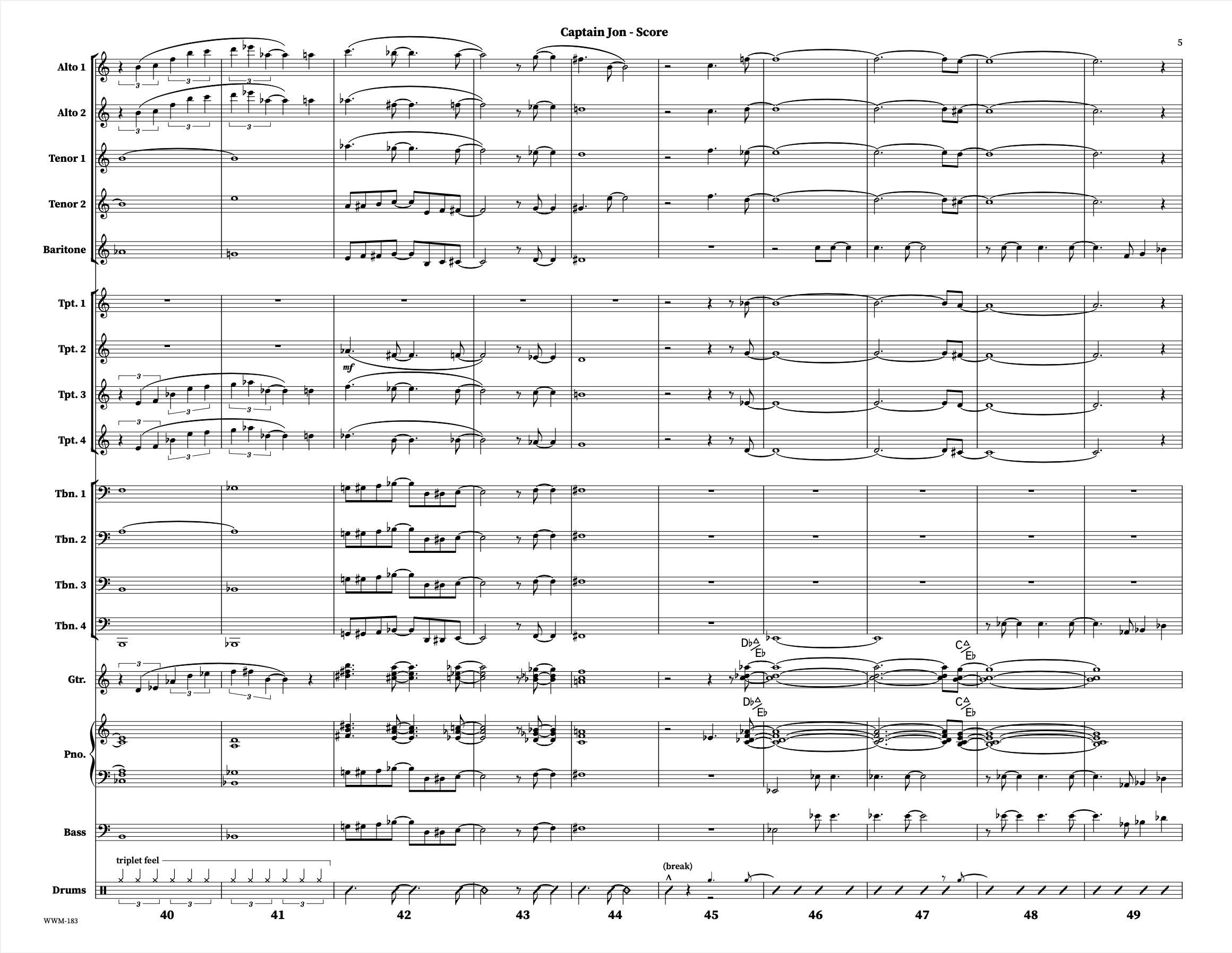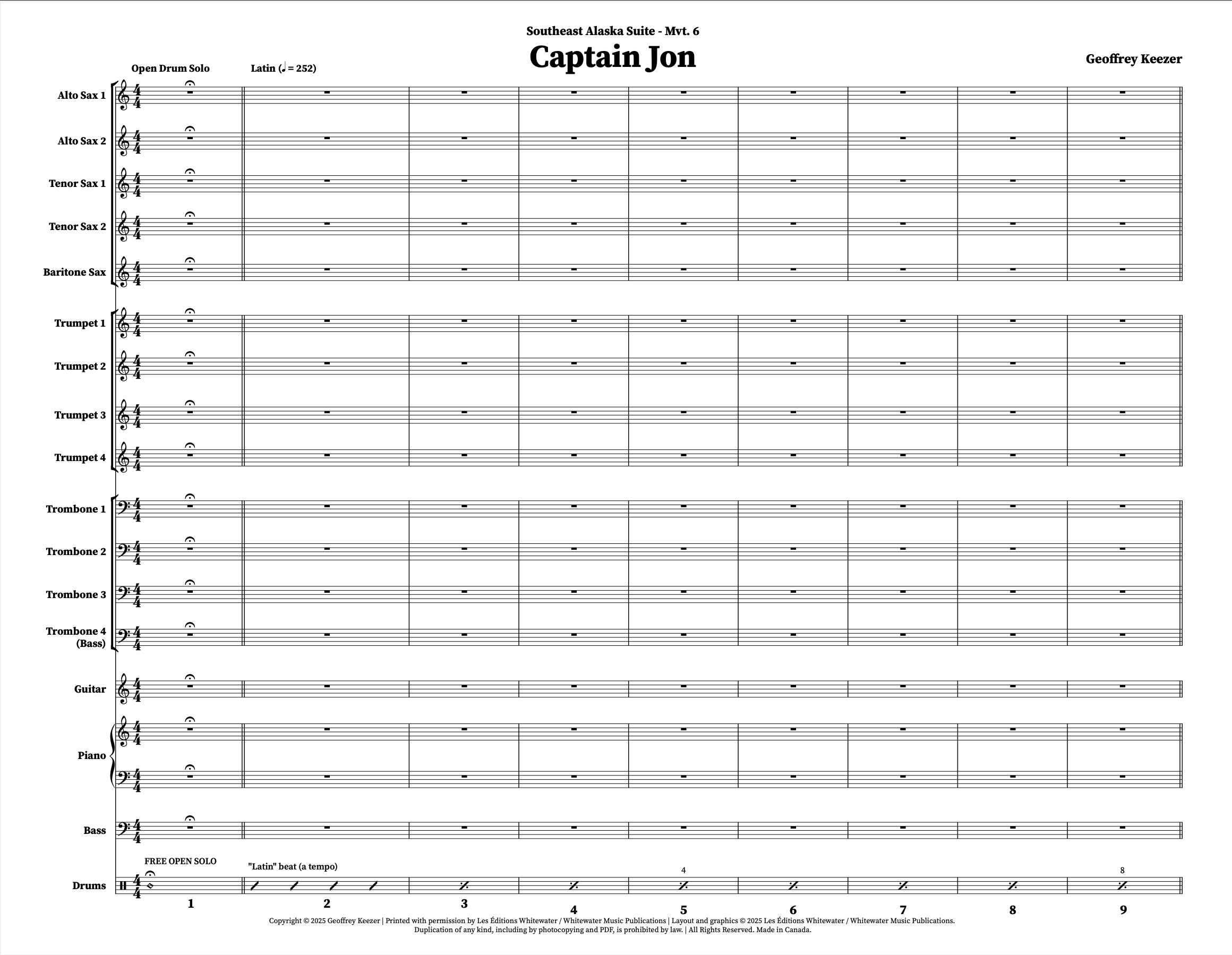 Geoffrey Keezer's "Southeast Alaska Suite" is an outstanding multiple-movement work commissioned by the Scottish National Jazz Orchestra in 2005. This sixth movement, "Captain Jon", is an up-tempo latin chart infused with modern harmonic language that features the trombone as the main soloist. Open drum solos begin and end the movement.