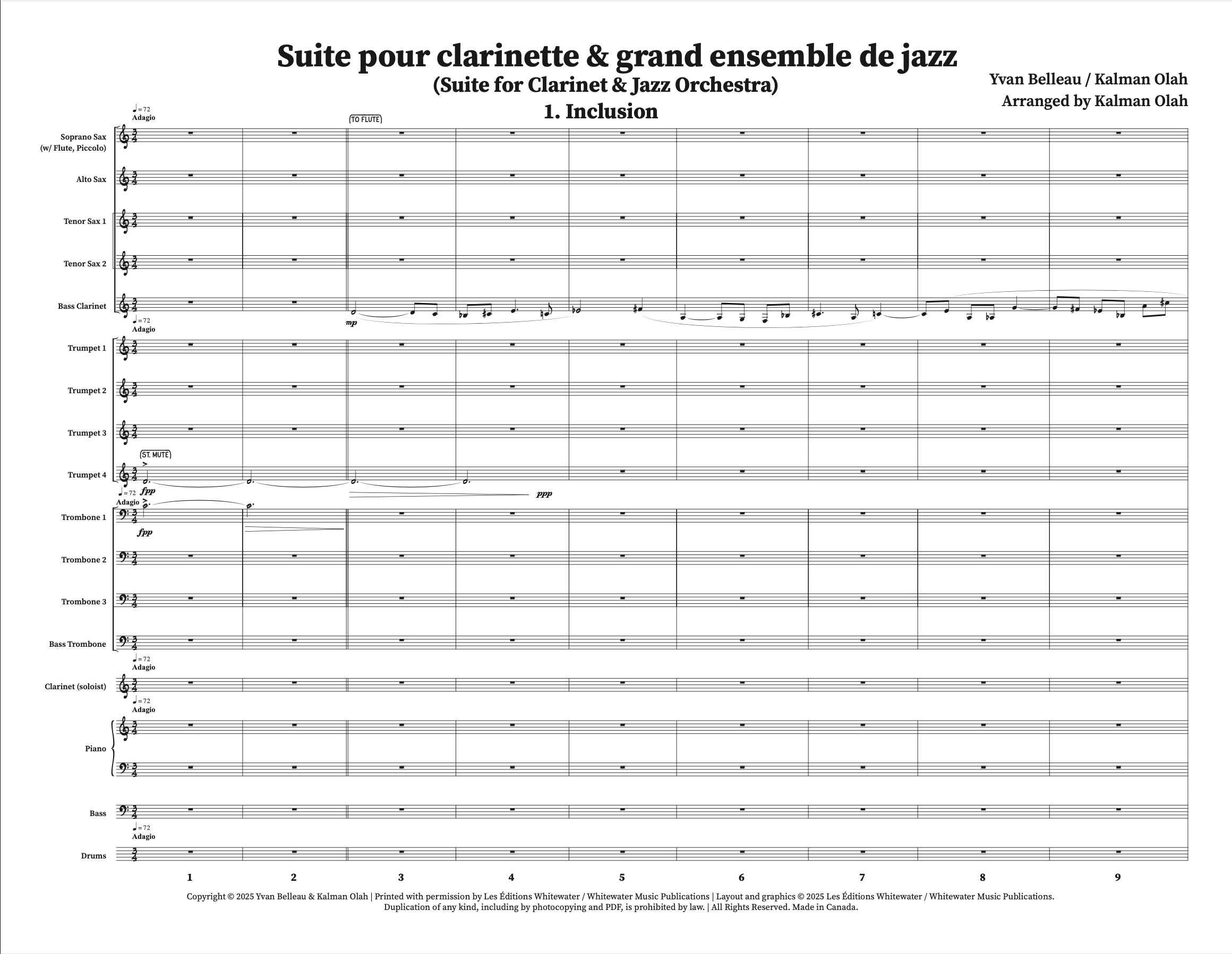 Yvan Belleau and Kálmán Oláh's "Suite for Clarinet and Jazz Orchestra" is an extended creative work for large ensemble, written as a collaboration between the two composers, that features clarinet as the principal soloist throughout.