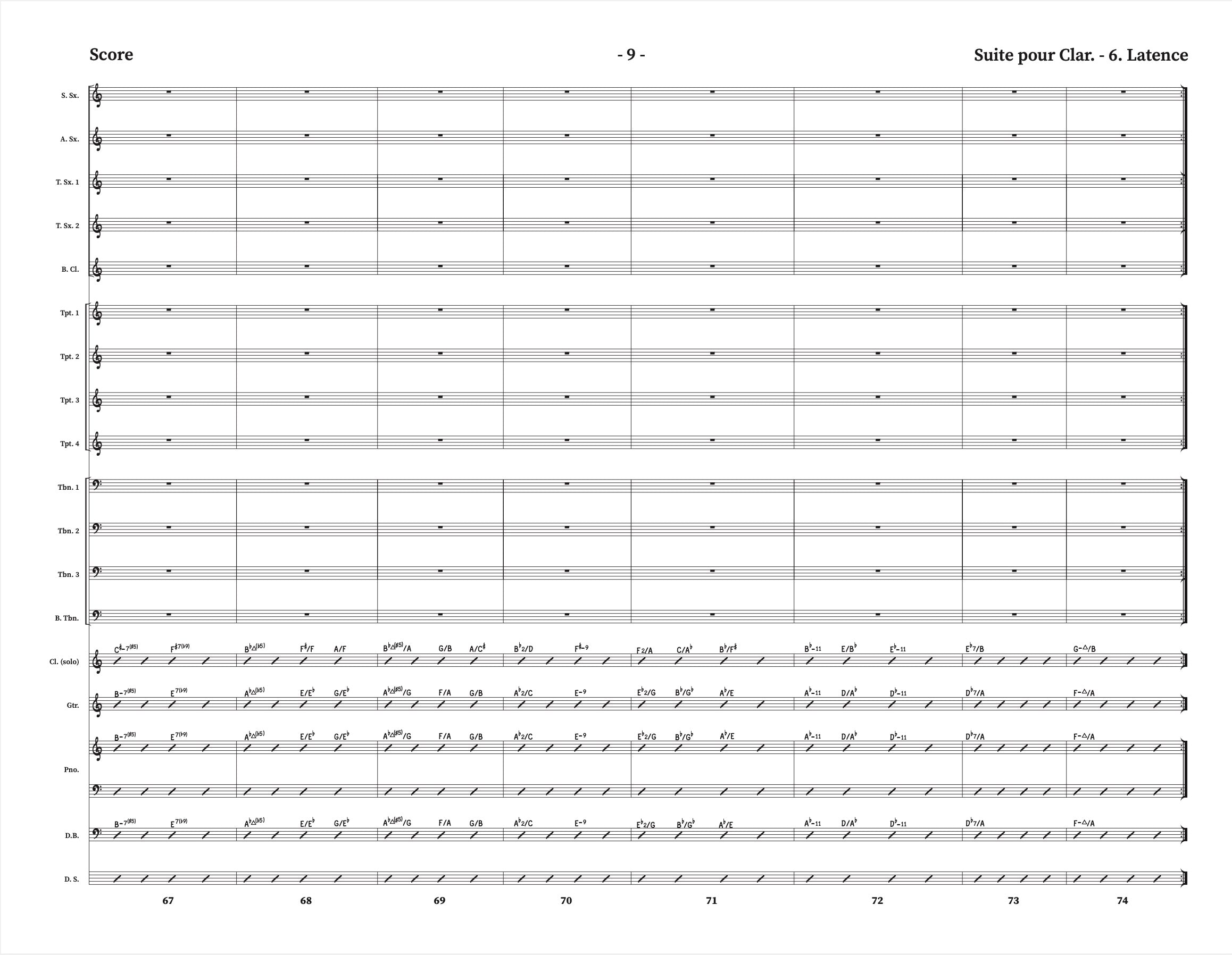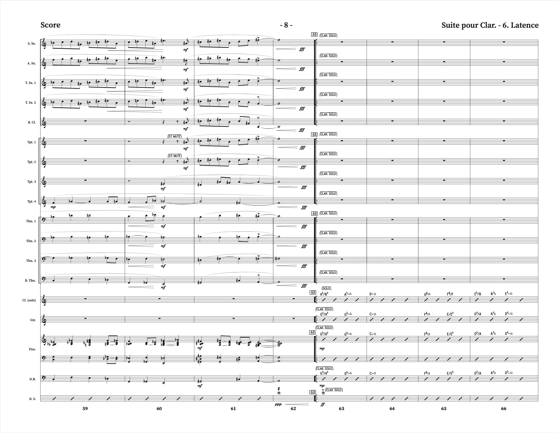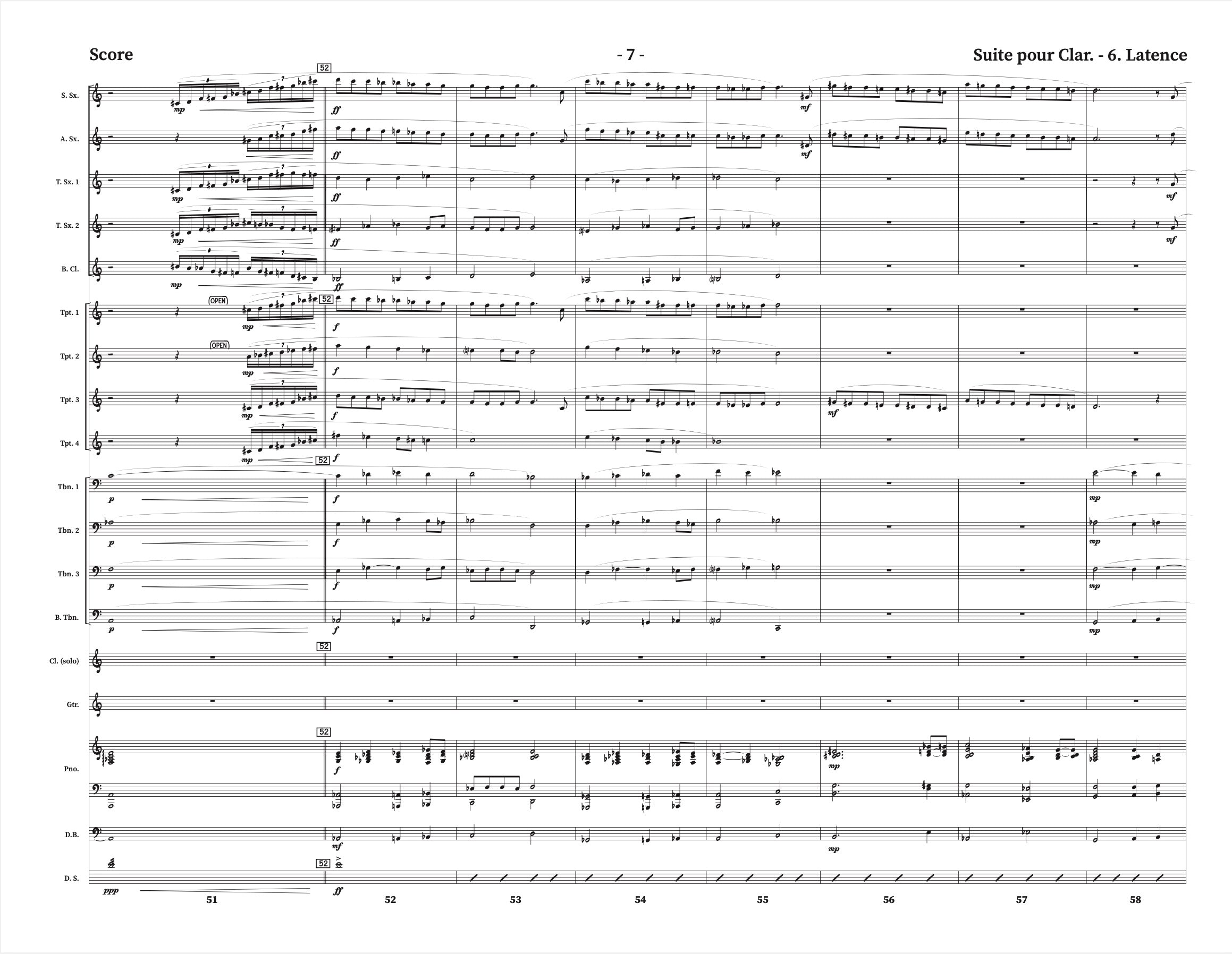 The woodwind configuration is: Solo Clarinet, Soprano Sax, Alto Sax, 2 Tenor Saxes, and Bass Clarinet.