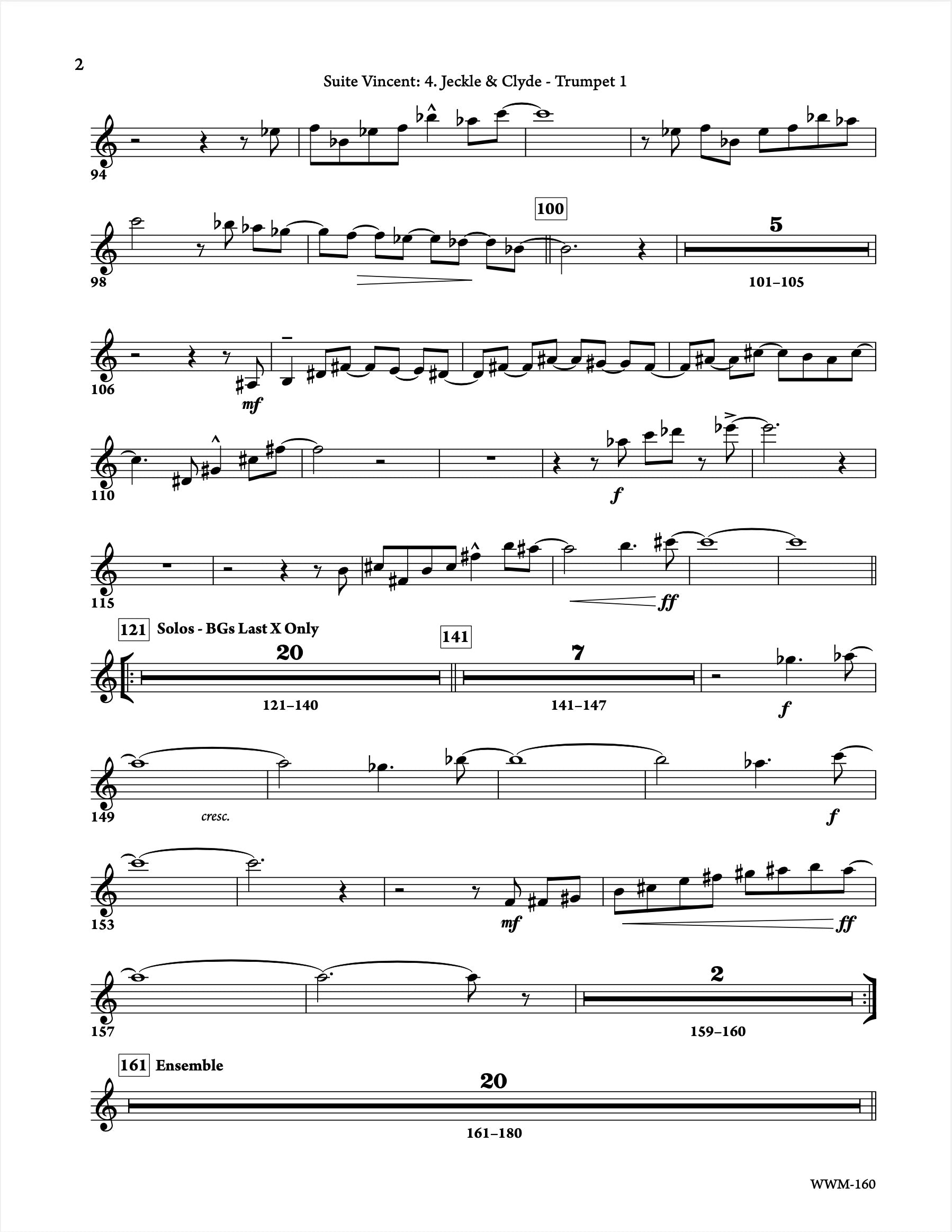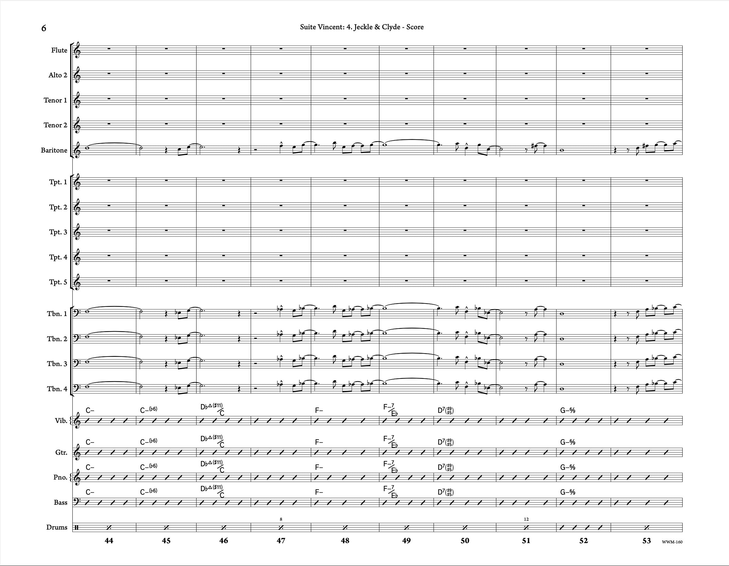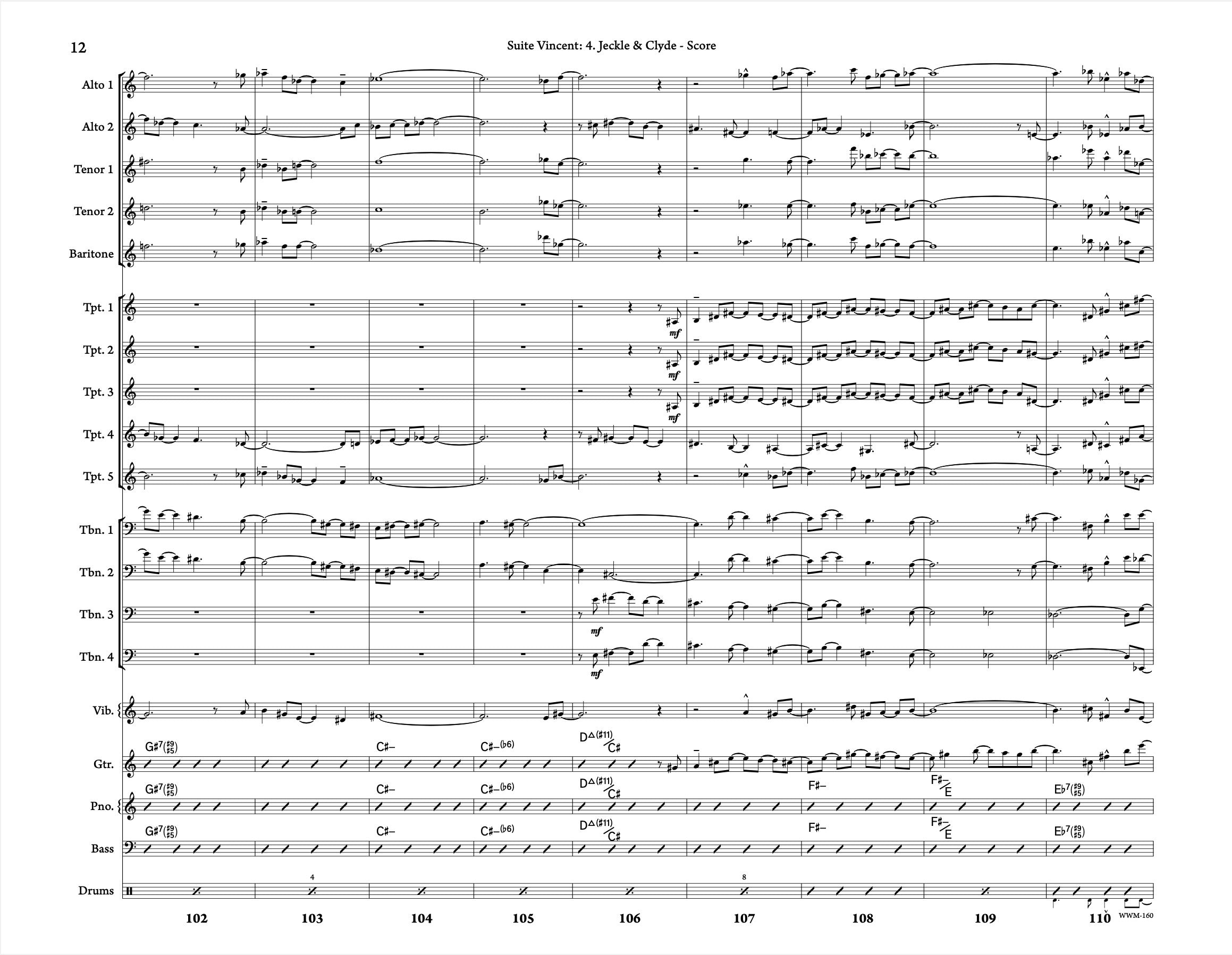 Jeckle & Clyde is the final movement of a four movement big band work created for a concert with the great Canadian jazz flugelhorn player Kenny Wheeler. Originally scored for 3 saxes, 3 trumpets, 1 trombone and rhythm, this version is scored for standard big band.
